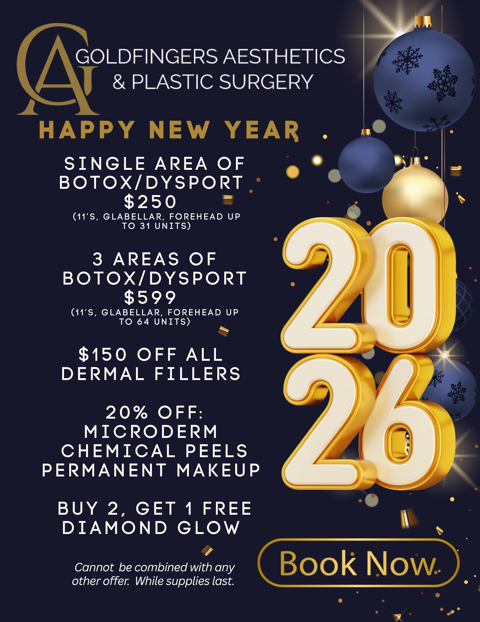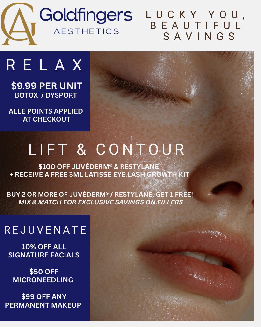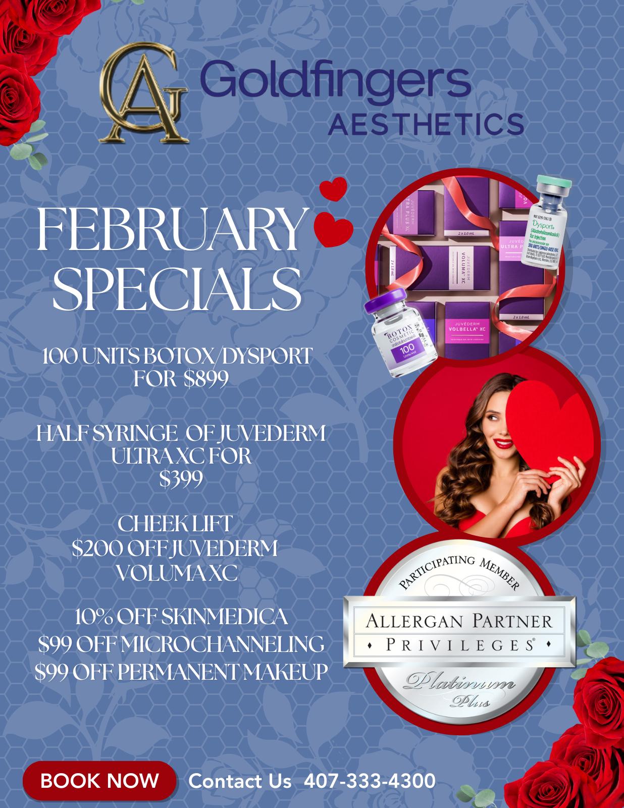 At Goldfingers Aesthetics we want you to look and feel your best all the time. which is why we offer monthly specials on our medical spa services. We are the largest medical spa in Florida and offer the latest medical aesthetic services ranging from BOTOX® & Dysport®, to dermal fillers like Restylane® and Juvederm®. Book an appointment with our medical aesthetics spa today. We would love to see you!