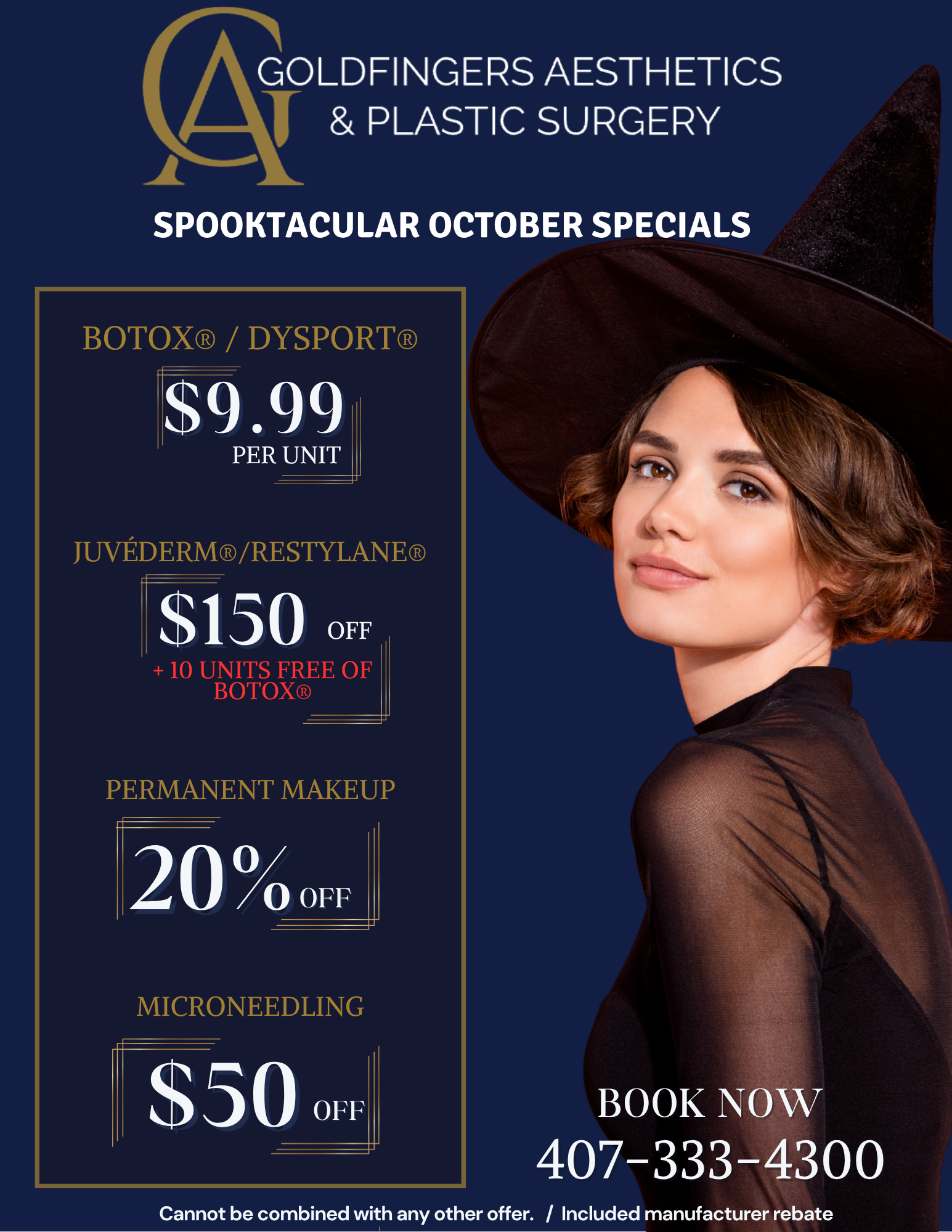 At Goldfingers Aesthetics we want you to look and feel your best all the time. which is why we offer monthly specials on our medical spa services. We are the largest medical spa in Florida and offer the latest medical aesthetic services ranging from BOTOX® & Dysport®, to dermal fillers like Restylane® and Juvederm®. Book an appointment with our medical aesthetics spa today. We would love to see you!